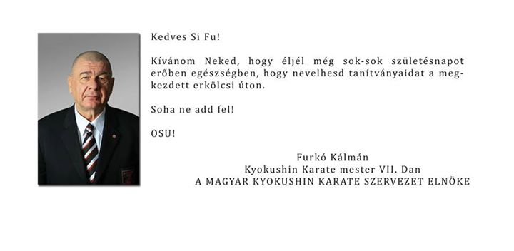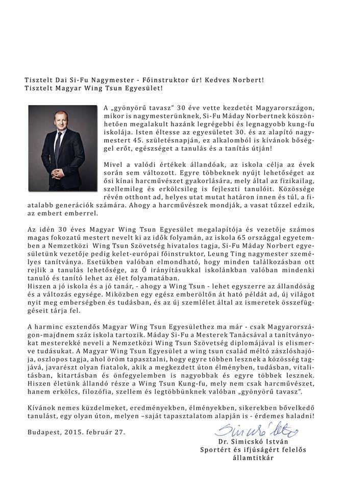 Sihan Furkó Kálmán gratulációja, Máday Norbert 9. fokozatú Wing Tsun nagymesternek, aki 30 éve oktatja a Wing Tsun Kung Fu-t Kelet-Európában (E.E.W.T.O.).